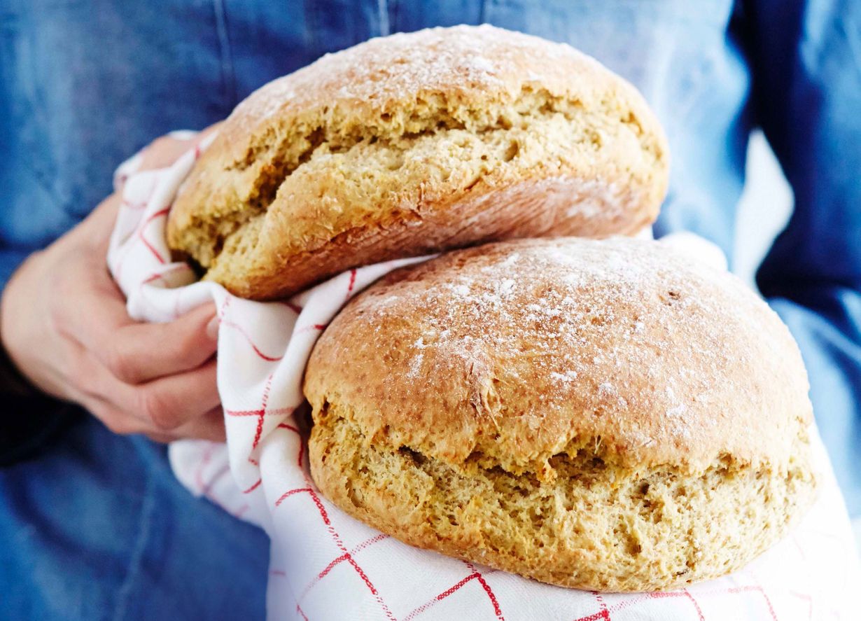 Paista leipä 200-asteisen uunin alatasolla noin 25 minuuttia, kunnes leipä on saanut väriä pintaansa ja vaikuttaa kypsältä.