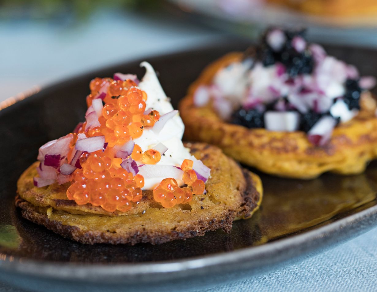Blinitaikina saa täyteläisen pehmeän maun bataatista. Katso reseptin lopusta, miten muunnat taikinan vegaaniseksi.