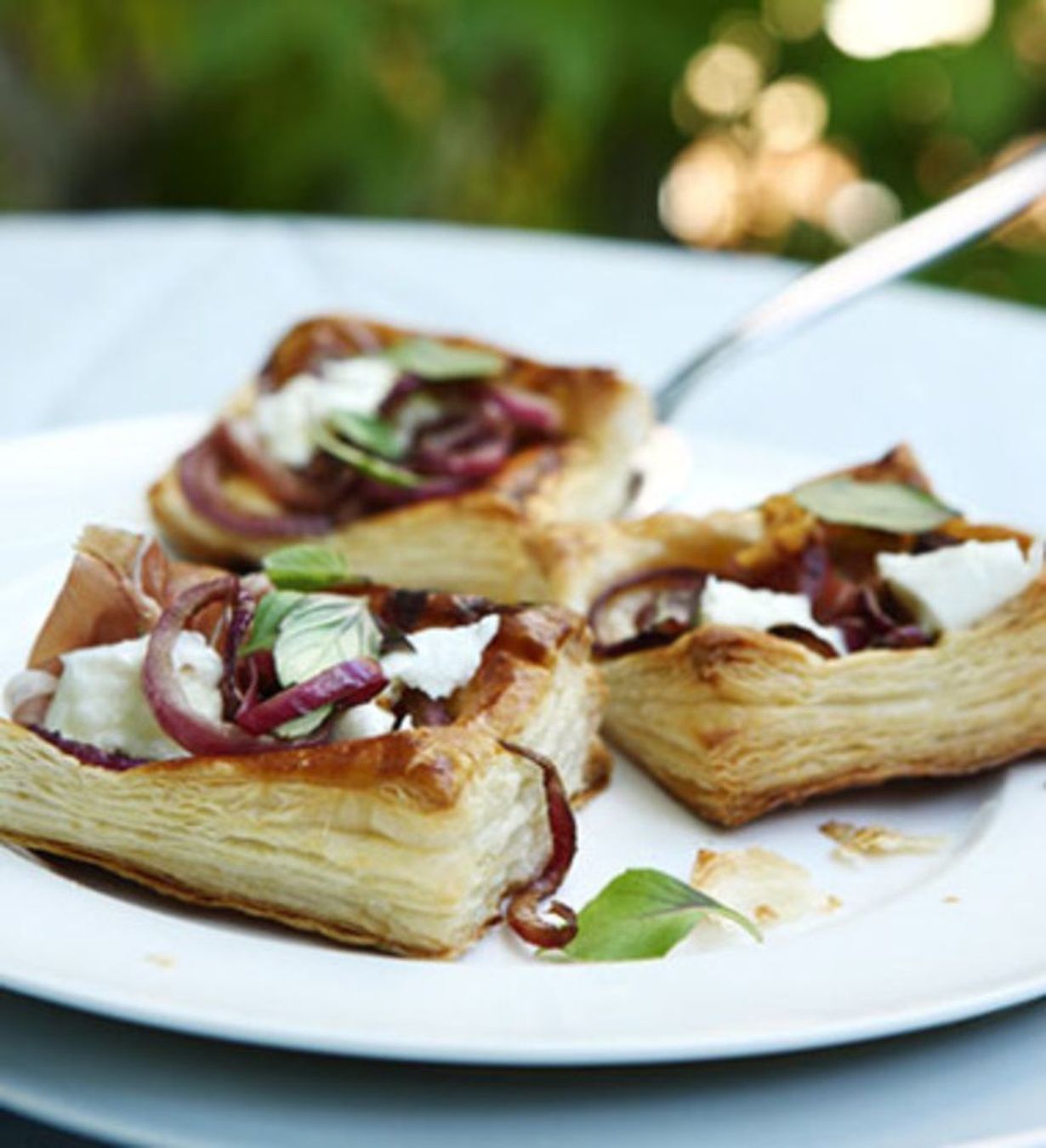 - Levitä päälle marinoituja puna-sipulirenkaita, ilmakuivattua kinkkua, buffalomozzarellaa ja tuoretta basilikaa. Tarjoile heti.