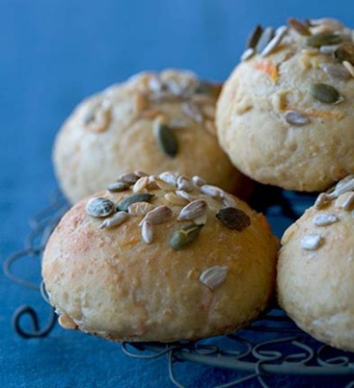 Sämpylöissä maistuu pirteä porkkana. Pintaa koristamaan sopivat kurpitsansiemenet.
