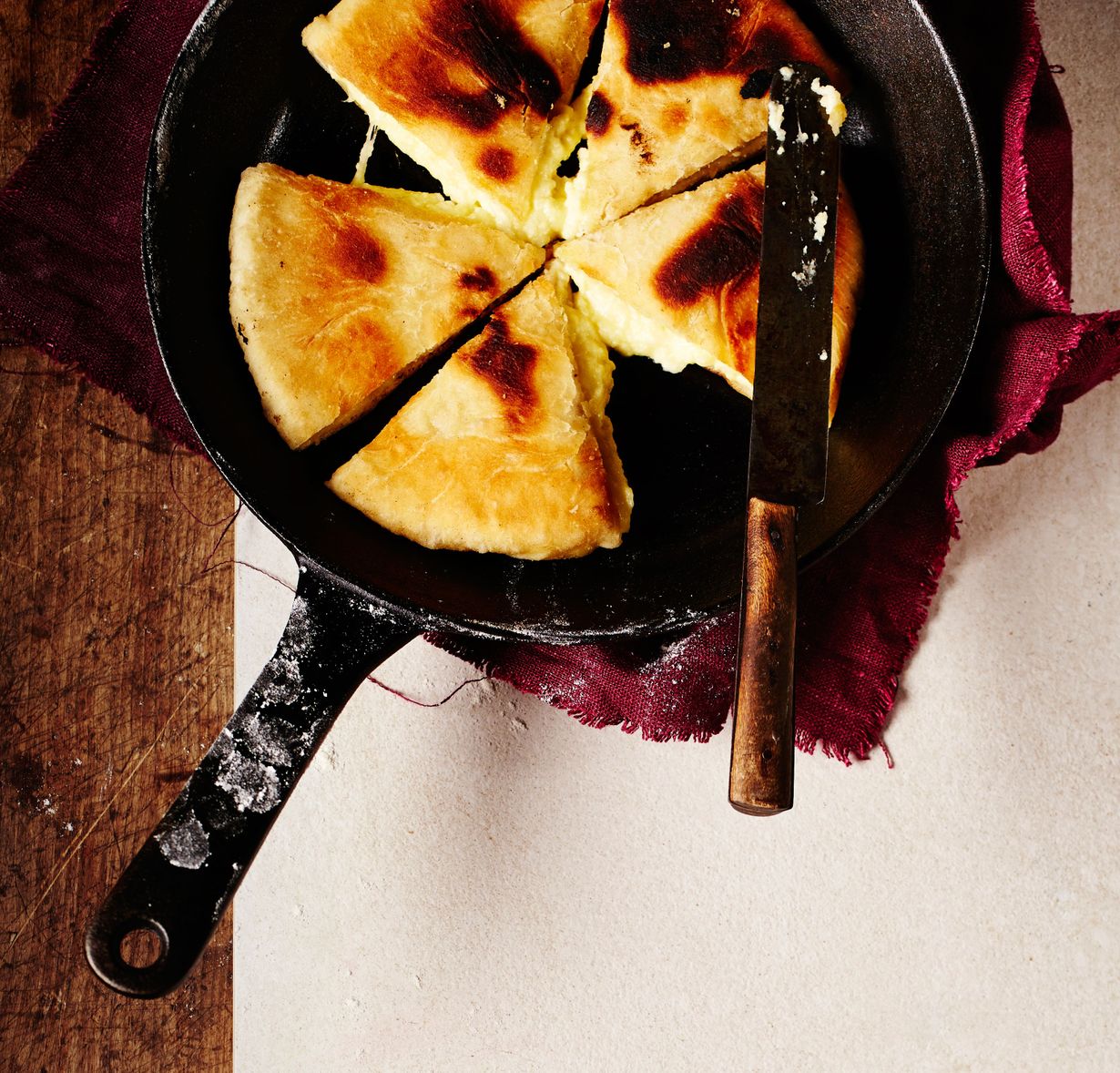 - Nosta taikina jauhotetulle pöydälle ja jaa se neljään osaan. Venyttele tai kauli palat kiekoiksi ( 20–25 cm). Jaa täyte kiekoille ja taputtele keskelle ympyräksi. Kerää taikinan reunat nyytiksi ja purista tiiviisti umpeen. Painele kiekot paistinpannuun sopiviksi, noin 20 cm:n leiviksi.