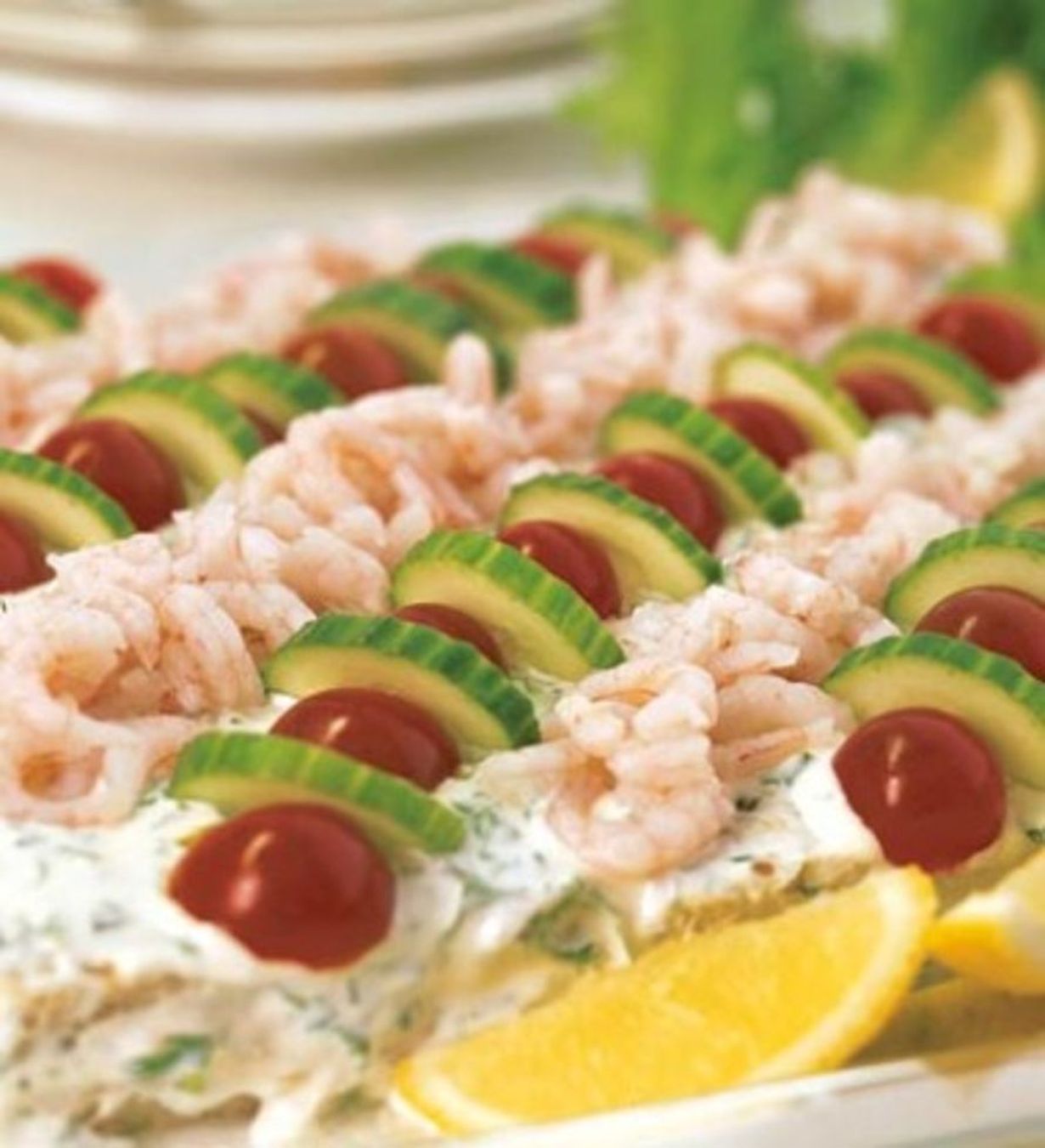 - Sekoita kuorrutuksen aineet keskenään ja levitä se kakun päälle ja reunoille. Puolita kirsikkatomaatit ja leikkaa kurkku viipaleiksi. Koristele voileipäkakku kurkulla, tomaateilla, katkaravuilla ja tillillä.