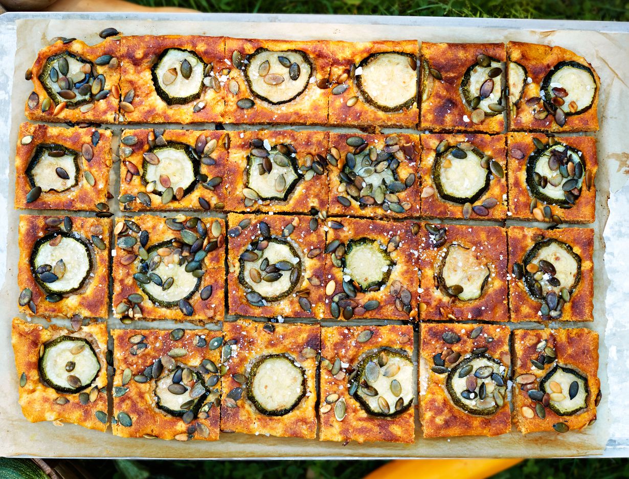 Taikinaan leivottu kurpitsasose antaa focaccialle kauniin värin. Rapean lisän leipä saa kurpitsansiemenistä. Pinnalle siivutetaan kesäkurpitsaa.
