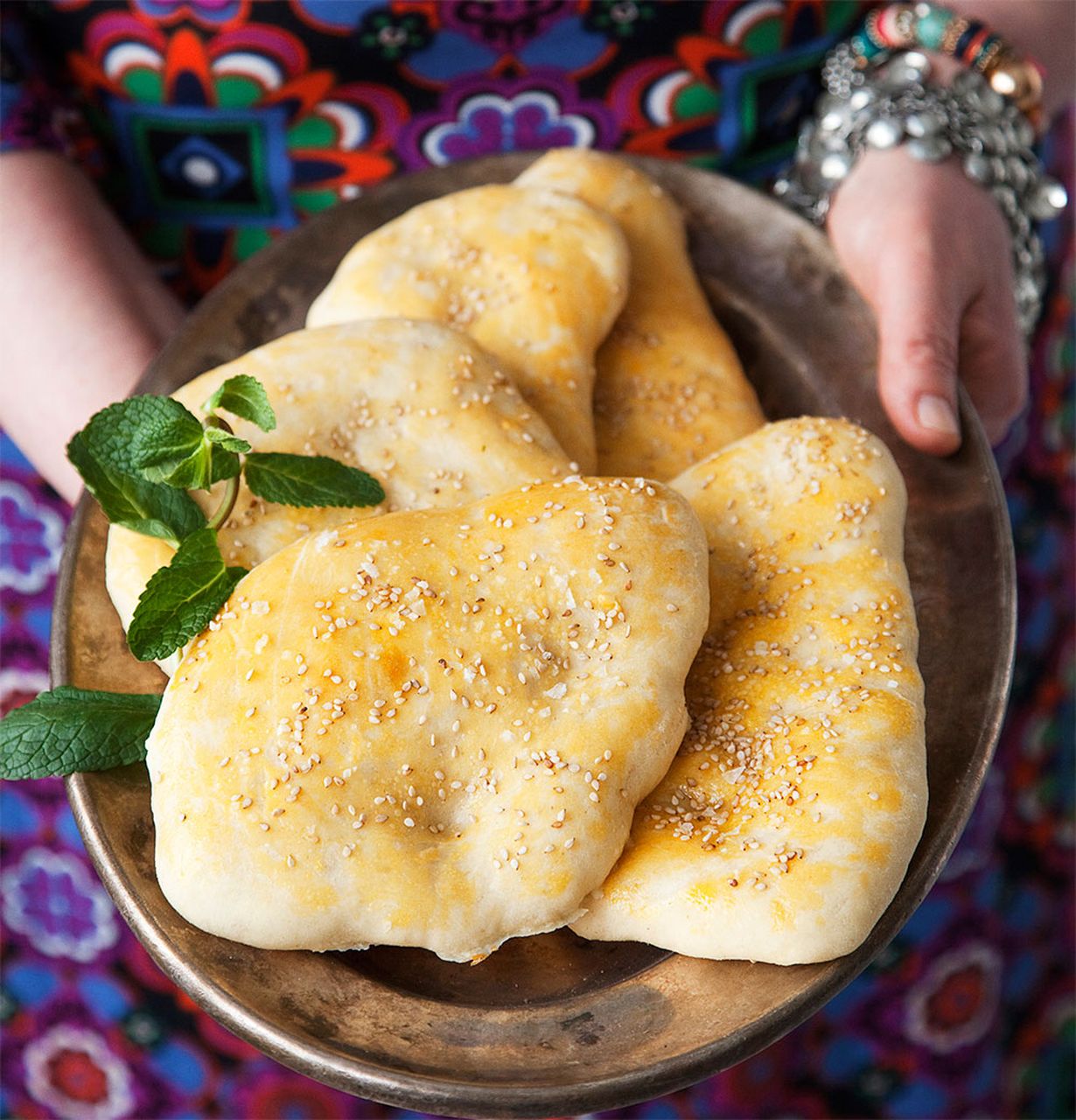 Pehmeä ja vaalea lavash-vehnäleipä sopii loistavasti mezejen kyytipojaksi.
