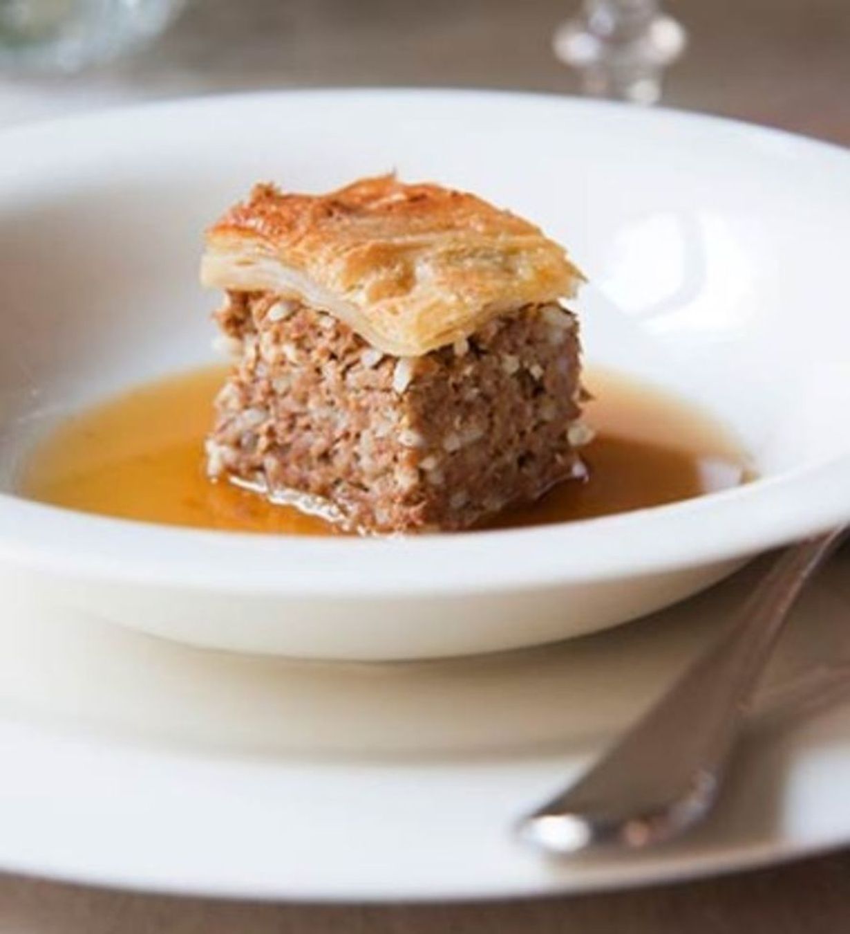 - Leikkaa piirakka paloiksi ja laita syvälle lautaselle. Kaada lämmintä lihalientä lautaselle ja nauti.