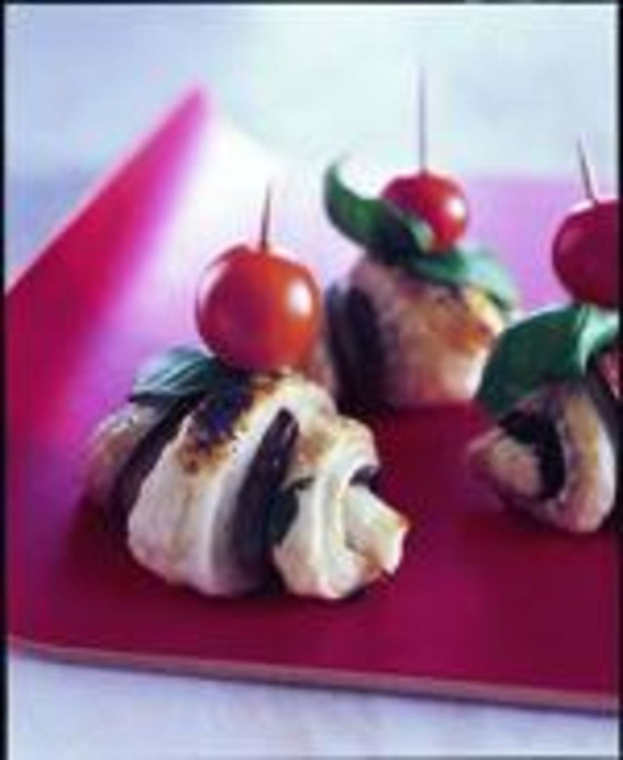 - Aseta grillatut munakoisoviipaleet taikinakolmioille. Leikkaa juusto puolen sentin tangoiksi ja laita juustotanko jokaiselle kolmiolle. Silppua päälle tuoretta oreganoa. Kierrä croissantit kolmion kannasta lähtien rulliksi.