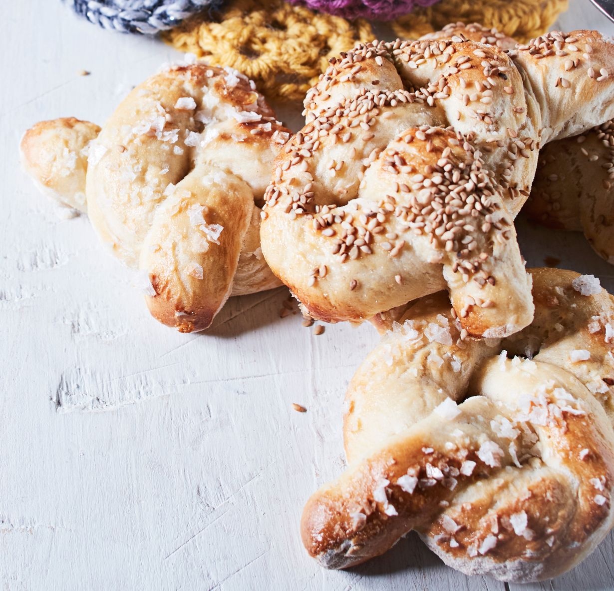 - Laita prezelit leivinpaperoidulle uunipellille ja voitele munalla. Ripottele pinnalle makusi mukaan sormisuolaa ja seeseminsiemeniä. Paista uunissa kullankeltaisiksi 10–12 minuuttia.