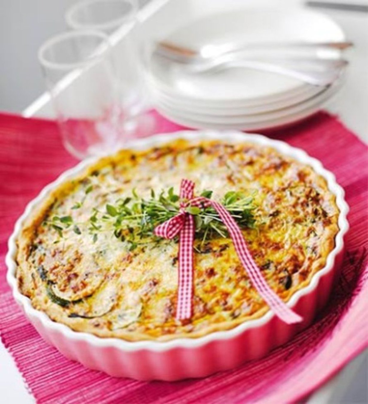 Kesäkurpitsapiirakkaan tulee lempeää makeutta perunasta ja punasipulista. Illanistujaisiin salaatin kanssa!