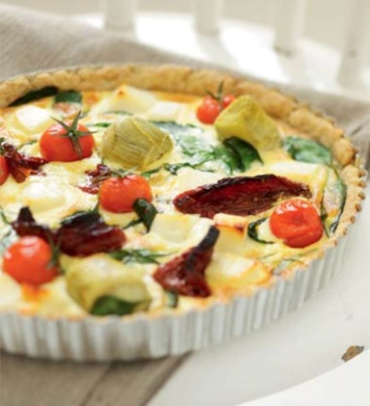 - Sekoita munat ja kerma. Kaada piiraspohjan päälle. Levitä pinnalle huuhdotut pinaatinlehdet, kirsikkatomaatit, valutetut artisokan sydämet, kuutioitu halloumijuusto ja aurinkokuivatut tomaatit.