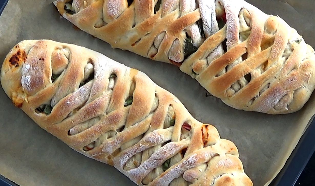 - Leikkaa sivuille jäävät taikinaosat parin sentin nauhoiksi. Nosta sivuilla olevat nauhat vuorotellen vasemmalta ja oikealta täytteiden päälle. Nosta pitkot varovasti leivinpaperoidulle uunipellille.