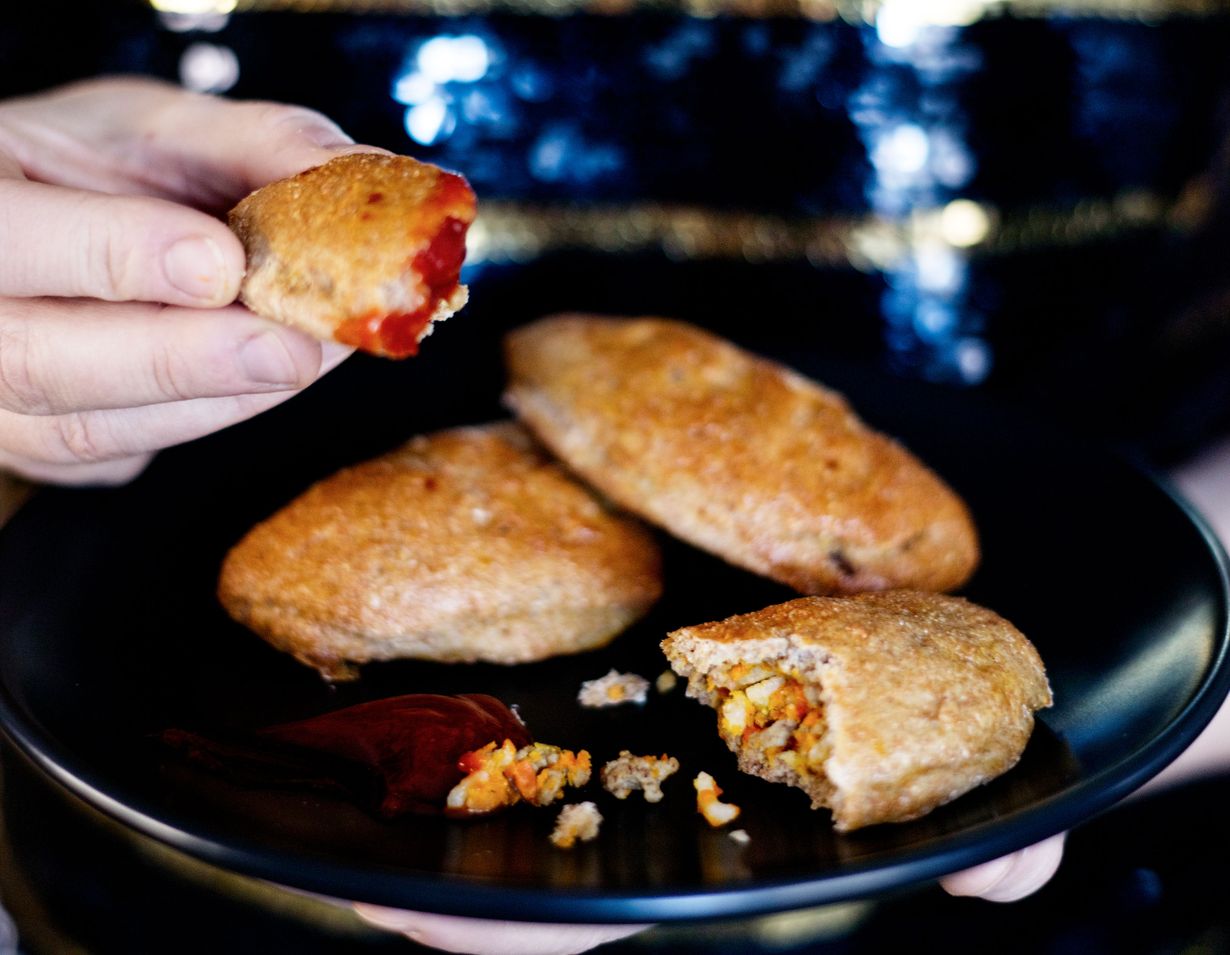 Porkkanalaatikosta ja paahdetusta jauhelihasta tulee maistuvia pieniä lihapiirakoita.