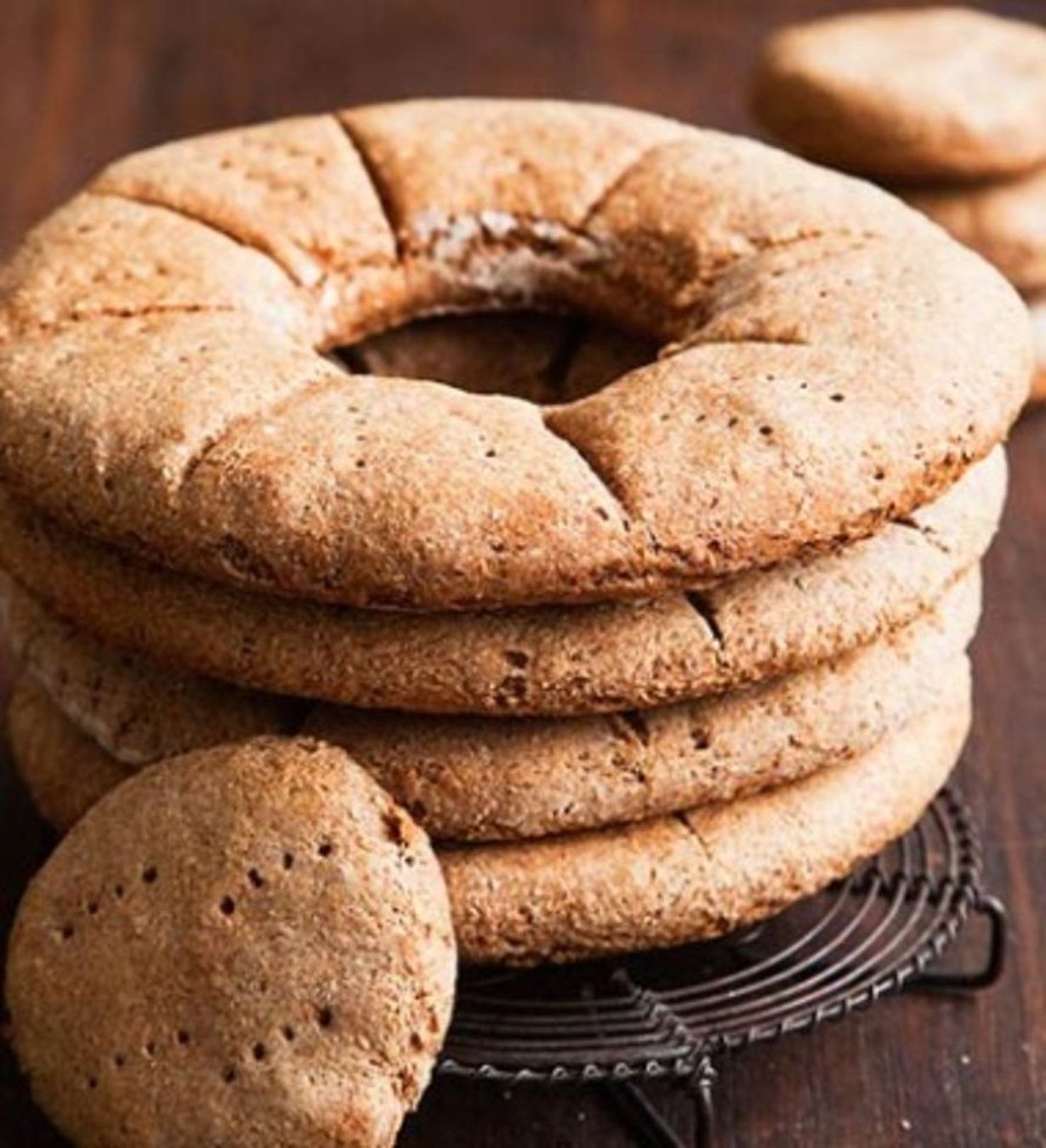 - Viillä reikäleipiin leikkausviillot ja pistele leipiä haarukalla. Paista 175 asteisen uunin alimmalla ritilätasolla noin 30 minuuttia. Suihkauta halutessasi vettä leiville paiston puolivälissä. Kääri leivät leivinliinaan jäähtymään, jotta kuori pehmenisi.