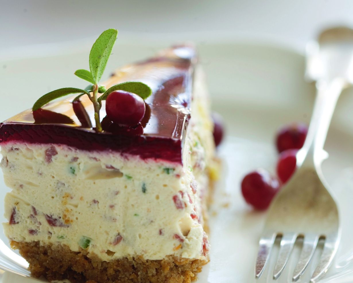 Suolainen juustokakku on helppo ja herkullinen juhlatarjottava. Sen voi tehdä mainiosti jo edellisenä päivänä jääkaappiin odottamaan. Savuporon makua tasapainottaa kirpeä karpalo, joka antaa kakulle myös upean ulkomuodon.