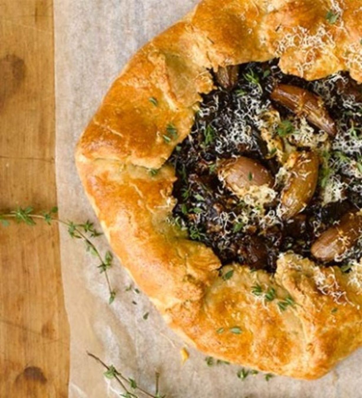 - Ota taikina jääkaapista ja kauli se jauhotetulla alustalla pyöreäksi (halkaisijaltaan noin 30 cm) levyksi. Reunat saavat jäädä mielellään hieman repaleisiksi. Nosta taikina kaulimen avulla leivinpaperilla vuoratulle uunipellille. Lisää sieni-sipulitäyte ja taita taikinan reunat osittain täytteen päälle. Ripottele päälle juustoraaste ja voitele taikinan reunat munalla.