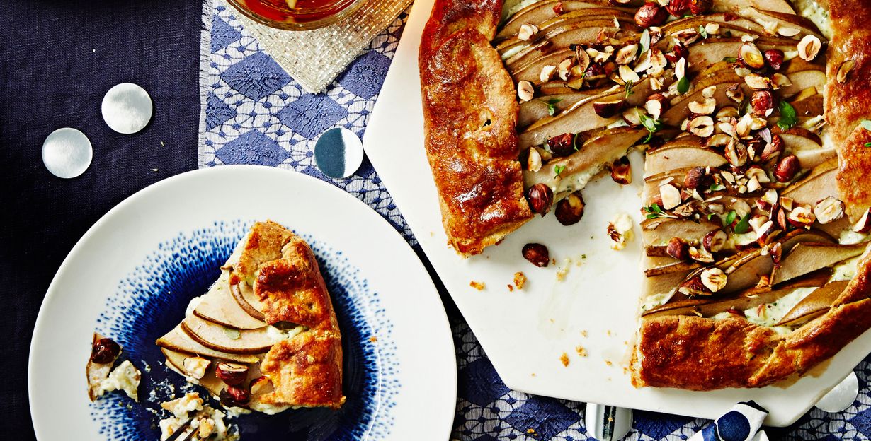 Päärynän alta paljastuu piirakan mehevä homejuustosydän. Spelttijauhot tekevät rahkavoitaikinasta erityisen maukkaan.