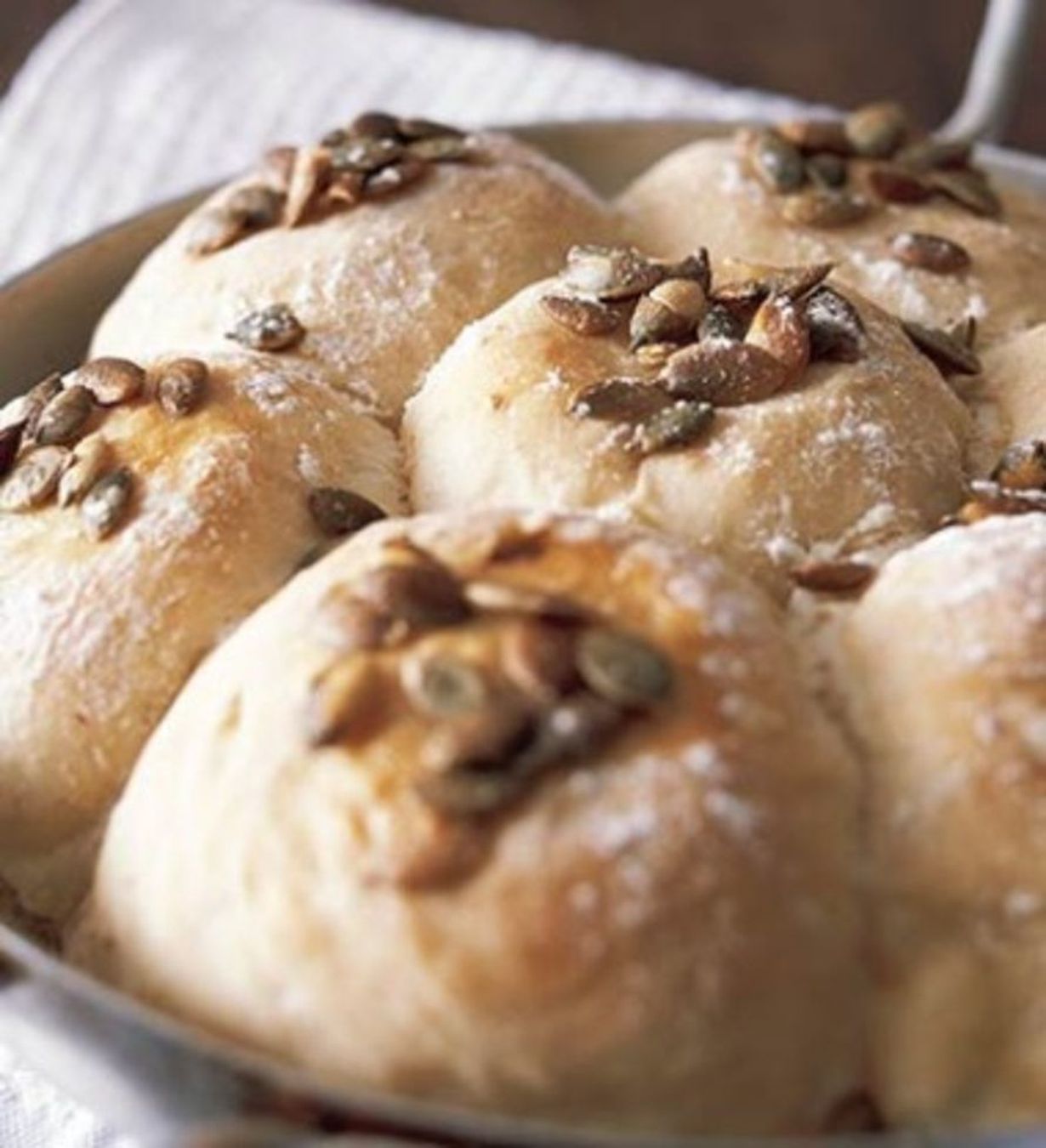- Nosta sämpylät leivinpaperin päälle uunipellille tai vuokaan harvakseltaan, muutaman sentin päähän toisistaan. Nostata vedottomassa paikassa noin 20 minuuttia. Sivele pinta vedellä ja ripottele koristeeksi kurpitsansiemeniä.