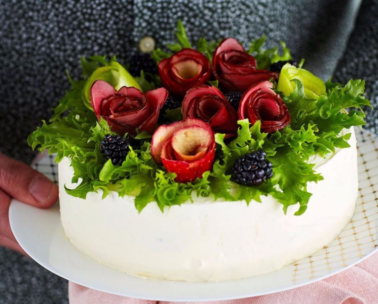 - Notkista tuorejuusto vatkaamalla ja kuorruta kakku. Koristele kakku salaatilla sekä suolalihasta ja omenoista tehdyillä ruusuilla. Viimeistele mustaherukoilla tai karhunvatukoilla.