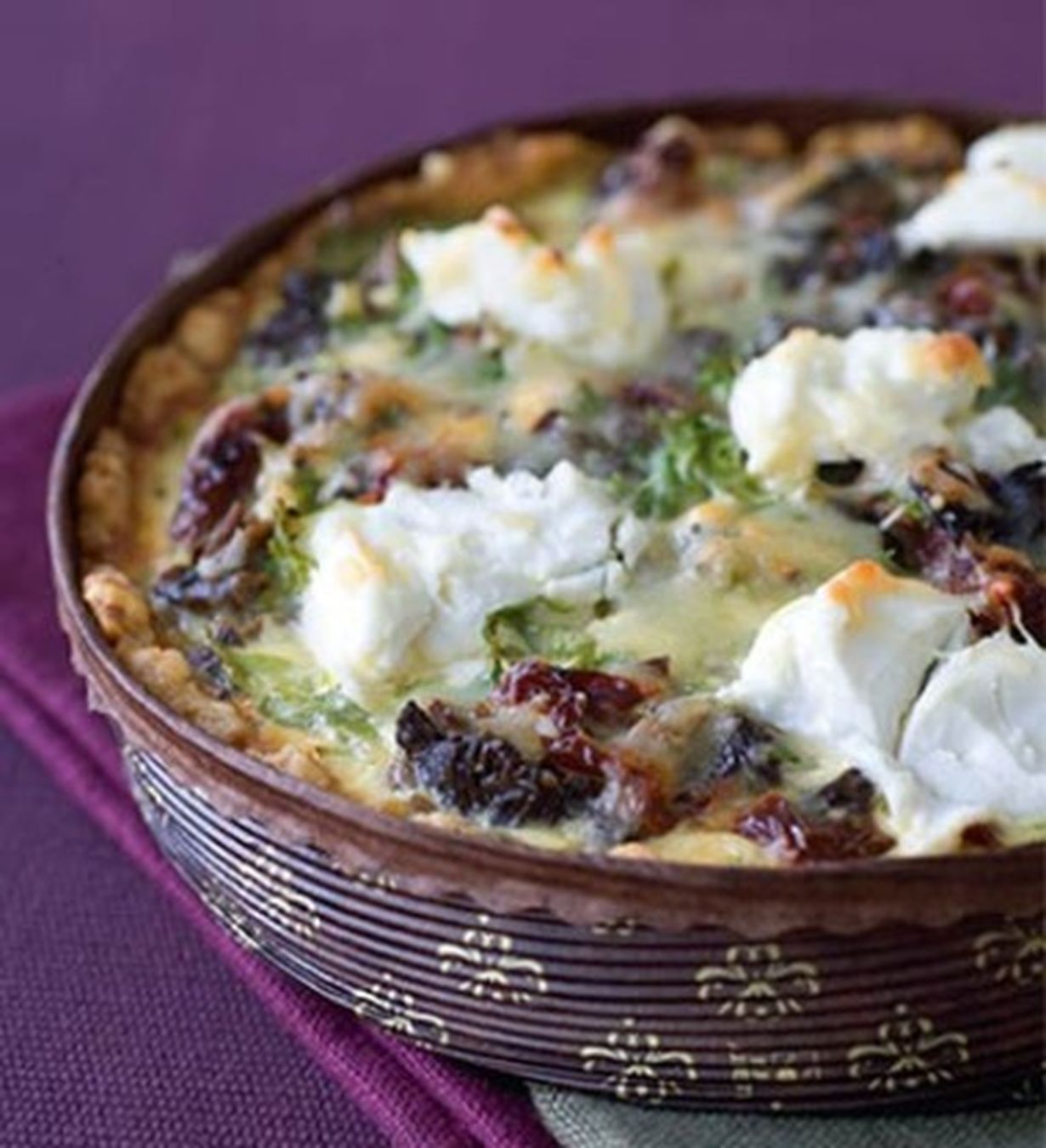 - Sekoita munakerman aineet tasaiseksi ja kaada täytteen päälle. Ripottele pinnalle juustoraastetta tai vuohenjuustonokareita.