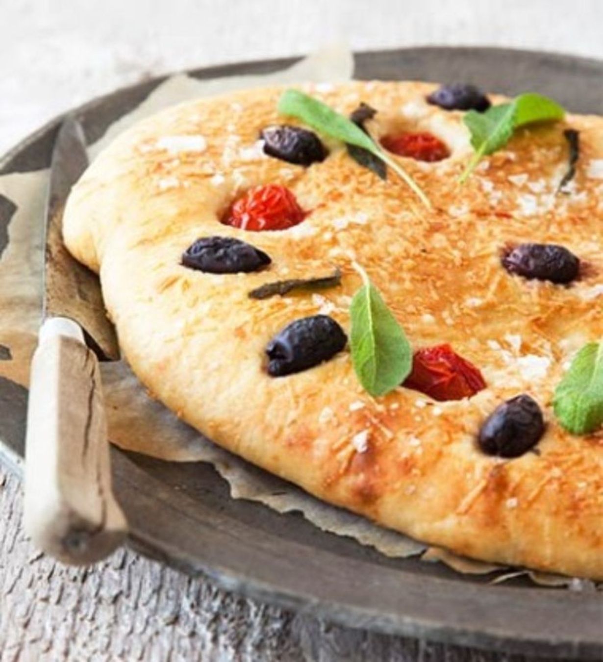 - Voitele leipä öljyllä ja ripottele päälle parmesaania. Koristele tomaateilla, oliiveilla ja halutessasi sormisuolalla sekä salvianlehdillä.