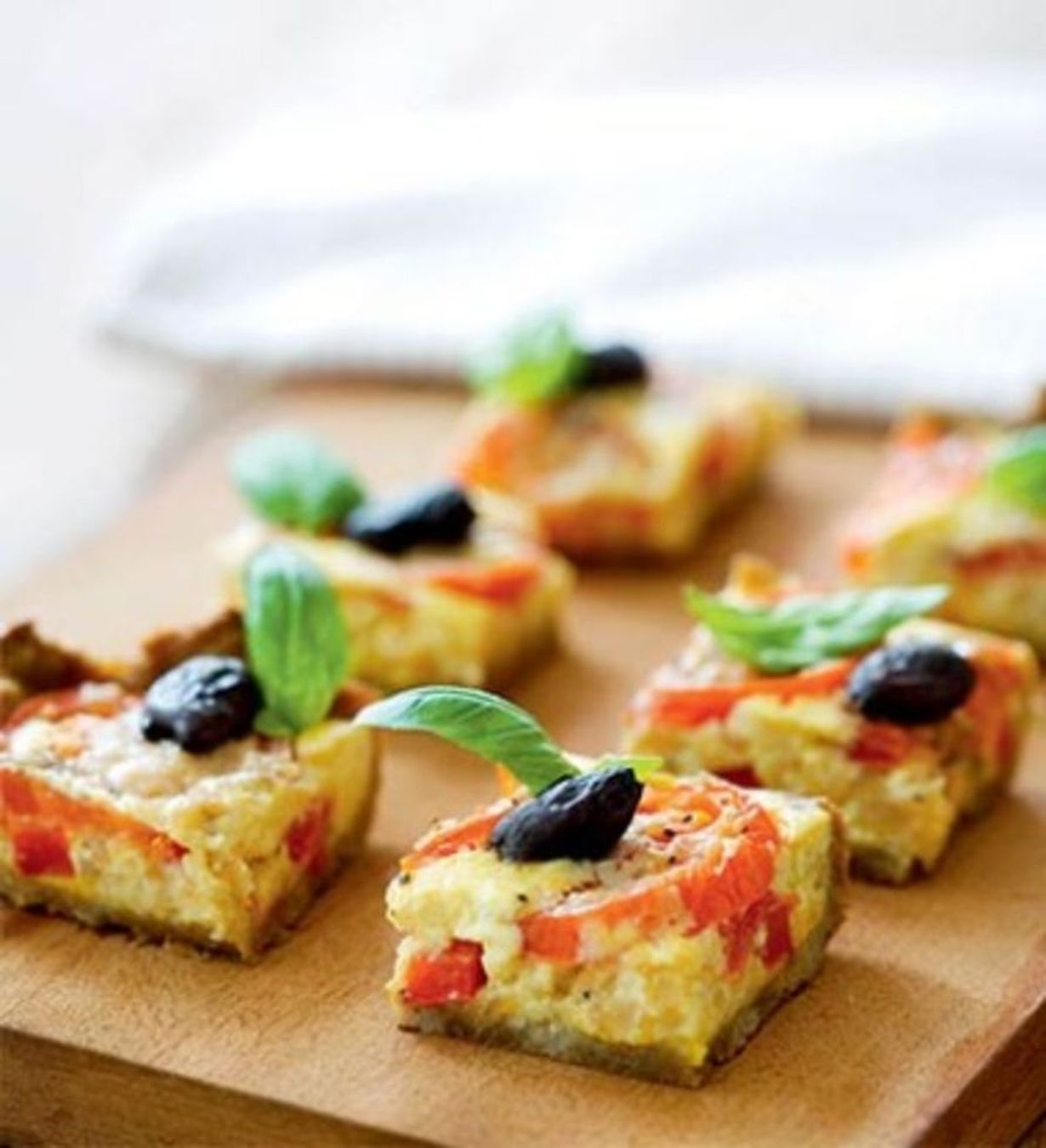 - Paista piirakkaa uunin alatasolla 200 asteessa 10-15 minuuttia ja vielä keskitasolla 15-20 minuuttia. Jäähdytä ja leikkaa pieniksi coctailpaloiksi. Koristele ennen tarjoamista basilikan lehdillä.
