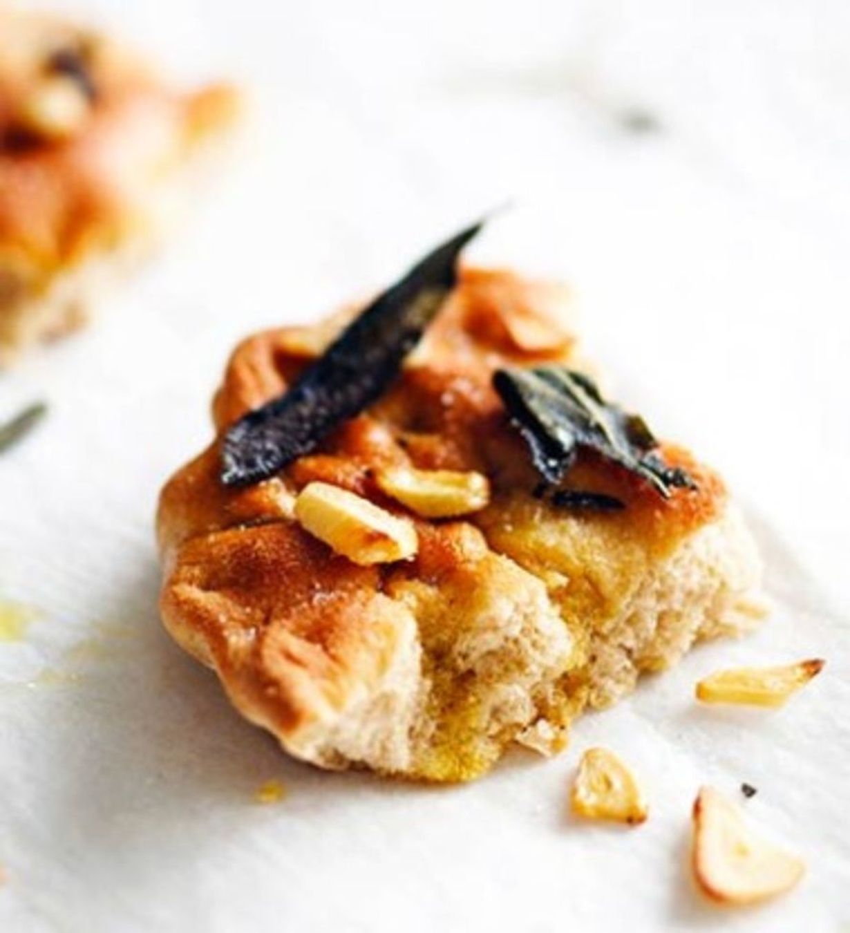- Voitele leivän pinta voisulalla. Kuori ja leikkaa valkosipulinkynnet ohuiksi viipaleiksi ja levitä tasaisesti leivän pinnalle. Aseta päälle vielä salvian lehtiä.