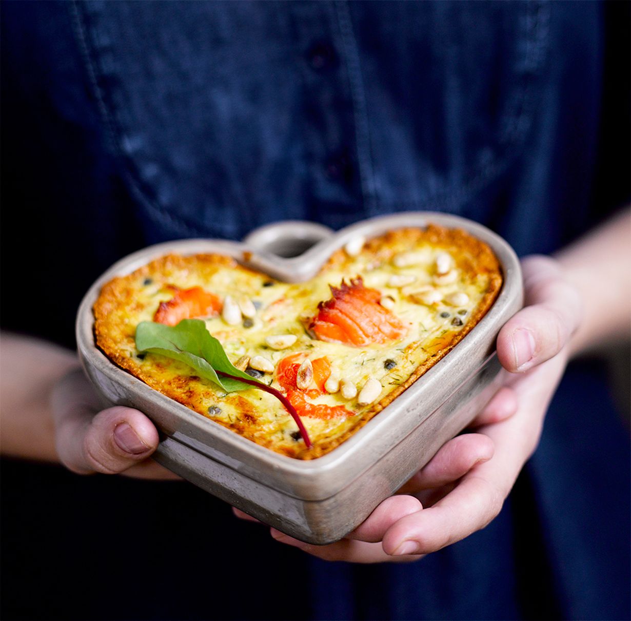 Tee lohiviipaleista ruusukkeet ja paina yksi ruusuke jokaisen vuokaan täytteen päälle. Paista 200 asteessa uunin alatasolla10 minuuttia ja lopuksi keskitasolla