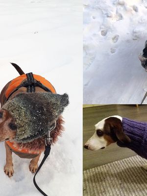 Ajankohtaista Katso hassut kuvat koirien pakkasmuodista: Nuuskalla pipo silmillä ja Lotalla hohtoneule